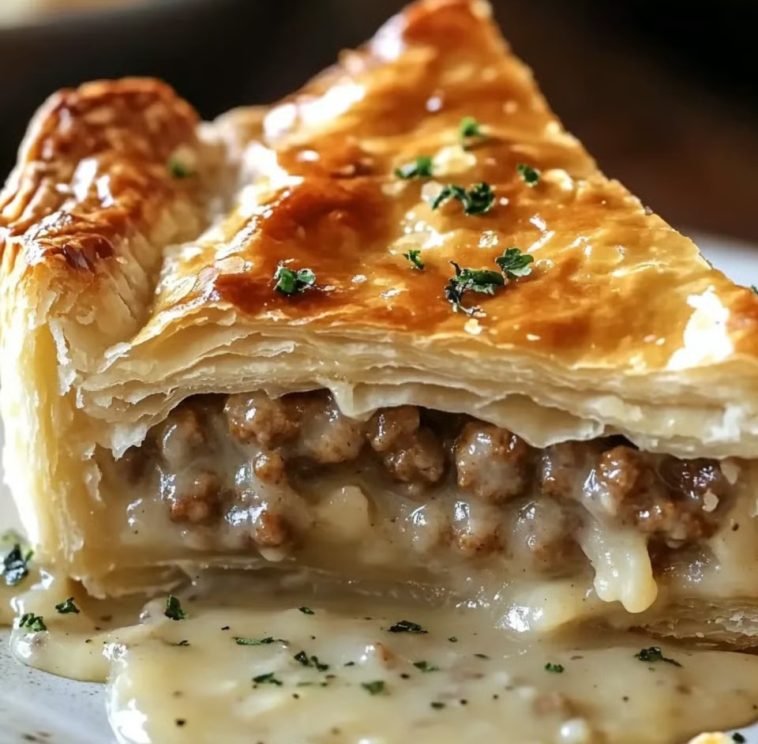 This savory pie combines the comforting flavors of homemade sausage gravy with the buttery layers of puff pastry. The sausage is browned and mixed with a creamy seasoned gravy, then encased in golden, flaky pastry. Seasoned with sage and pepper, this hearty dish bakes to golden perfection in just 30 minutes. The result is a rustic, crowd-pleasing meal that’s perfect for breakfast, brunch or dinner.